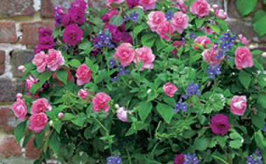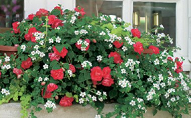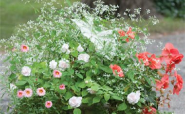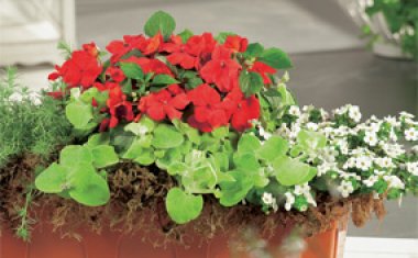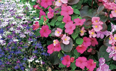 We couldn’t resist mixing a few flowers for shade gardens into the collections. Despite common wisdom, there are lots of choices for colorful flowers that thrive in the shade. Pink or orange impatiens, begonias, and fuchsia really pop against cool green foliage, while the blue and purple tones of Jacob’s Ladder, Torenia, and hydrangea evoke a more meditative mood.