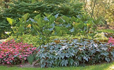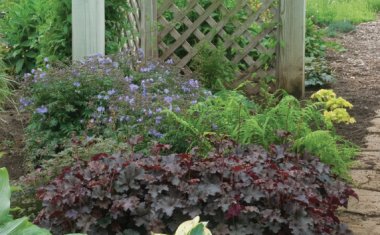 Our shade garden ideas take full advantage of foliage to create color and contrast for a cool retreat when the summer heats up. We’ve combined large full leaves with feathery ferns and ruffled or variegated foliage to create a setting that invites you to pause and take in the scenery. The various sizes, shapes, and textures of these shade garden favorites offer a restful counterpoint to a sunny summer garden.