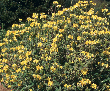 Bold plant with unique flowers for the back or middle of the garden. In warmer climates Jerusalam sage performs as an evergreen shrub, and in colder regions dies back in winter and regrows from the ground each spring. An excellent, easy care plant that is drought tolerant, rabbit and deer resistant and despite its size, does not usually need staking in the garden. Blooms make long-lasting cut flowers.