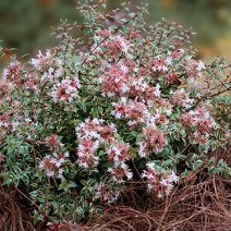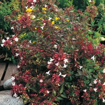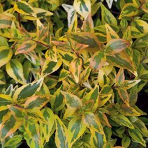 Foliage variegation changes from gold in spring to a burst of red, orange and yellow in summer and green for late fall. White, bell shaped flowers persist well into autumn. Attractive and compact, use as a low-growing hedge, mass planting, or as an accent. Prune in late winter or early spring, removing crossing branches to encourage a strong framework.